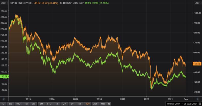 Uno de ellos es el sector energético, así como también el de extracción de petróleo. El sector de energía (XLE) se ubica un 52% debajo de sus máximos históricos de 2014 así como también un 14% debajo de sus máximos recientes.