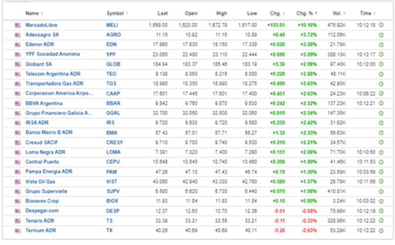 En términos de ADR, se destaca MercadoLibre, con un rally del 10%, seguido por AdecoAgro, Edenor, YPF y Globant, que ganan entre 2,8% y 3,7%.