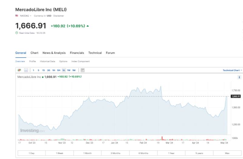 Las acciones de MercadoLibre suben con fuerza tras la presentación de balances en el día de ayer, correspondientes al primer trimestre del año.