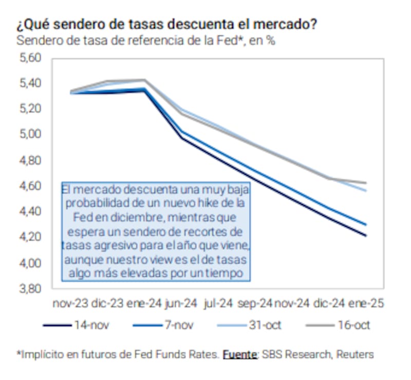 Juan Manuel Franco, economista jefe de Grupo SBS, consideró que la Fed podría "saltear" en la reunión de diciembre la suba de tasas remanente de 2023, en línea con la baja probabilidad implícita en los futuros de Fed Funds Rates.