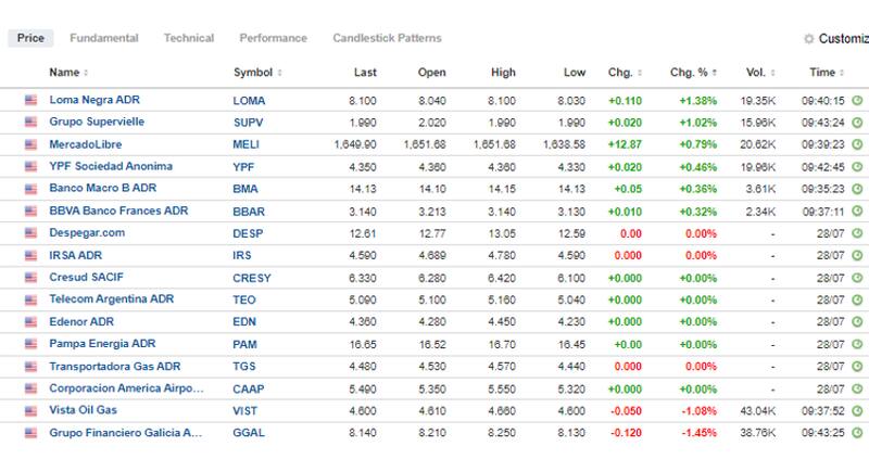 Loma Negra y Grupo Supervielle lideran las subas, con ganancias de 1,38% y 1,02%, seguida por MercadoLibre, YPF y Banco Macro que suben entre 0,8% y 0,36%. Del lado perdedor, Grupo Financiero Galicia y Vista Oil retroceden 1,45% y 1,15 respectivamente.