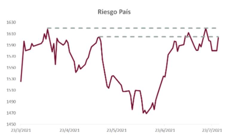 Los analistas de Cohen explicaron que los 1603 puntos del riesgo país se explica por el nerviosismo local, característico de un año electoral y evidenciado en el alza del CCL, aunque también se sumó el mal humor global, devenido de la situación de China y nuevos temores ante la variante Delta de coronavirus.