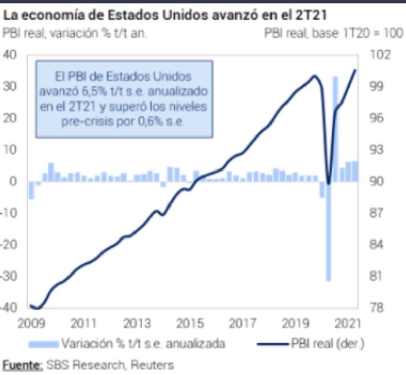 El PBI de Estados Unidos avanzó 6,5% en el segundo trimestre, superando levemente la marca del trimestre anterior. De todos modos, estuvo bastante por debajo de la expectativa, ya que el mercado esperaba un crecimiento en el rango de 8,5%.