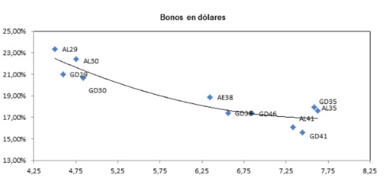 Martin Saud, senior trader de Balanz afirmó que "los bonos en dólares, hoy estar operando por paridad y no por rendimiento, por lo que tienen un valor cerca del recovery value estimado. De esta manera, los bonos cortos rinden más que los de mayor plazo y eso hace que la curva este con pendiente negativa. Para tener una pendiente positiva son necesario cambios estructurales a largo plazo", señaló.