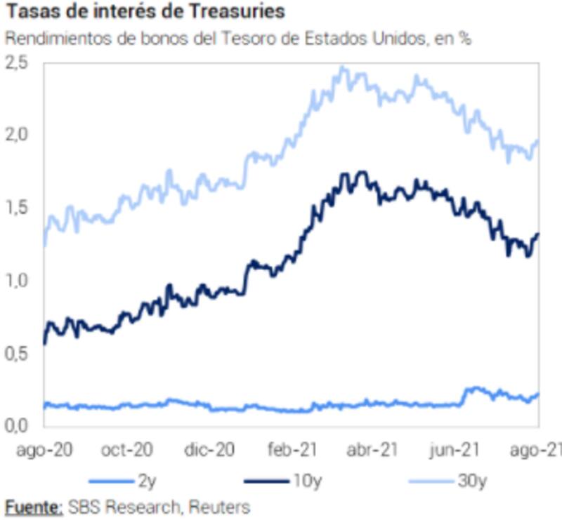 Mientras tanto, las tasas de interés de los bonos se mantienen sin grandes cambios. La tasa americana a 10 años pasó de 1,8% a 1,17% la semana pasada, para luego rebotar a los 1,28% actuales.