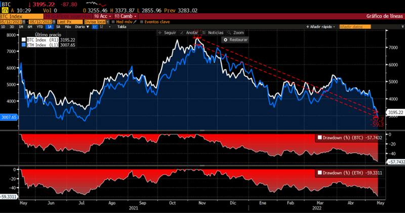El Bitcoin acumula una baja del 57% desde sus máximos recientes y el Ethereum pierde 59% desde sus picos.