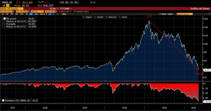 El ETF ARK Innovation (ARKK) de acciones de crecimiento a largo plazo, acumula una pérdida del 76% desde sus máximos históricos, enfrentando el bear market más importante en su historia.