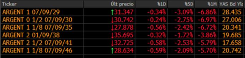 Los bonos argentinos inician la jornada a la baja. Todos los tramos soberanos argentinos operan en negativo y en el último mes acumulan caídas de entre 3,8% y 7%.