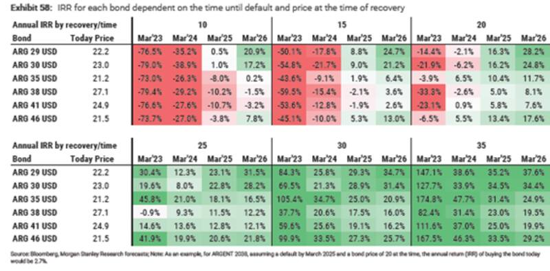 En ese sentido, desde Morgan Stanley remarcan que al revisar los posibles escenarios de reestructuración, los bonos están valorando un recorte mayor del 40% y una extensión de cuatro años de las amortizaciones.