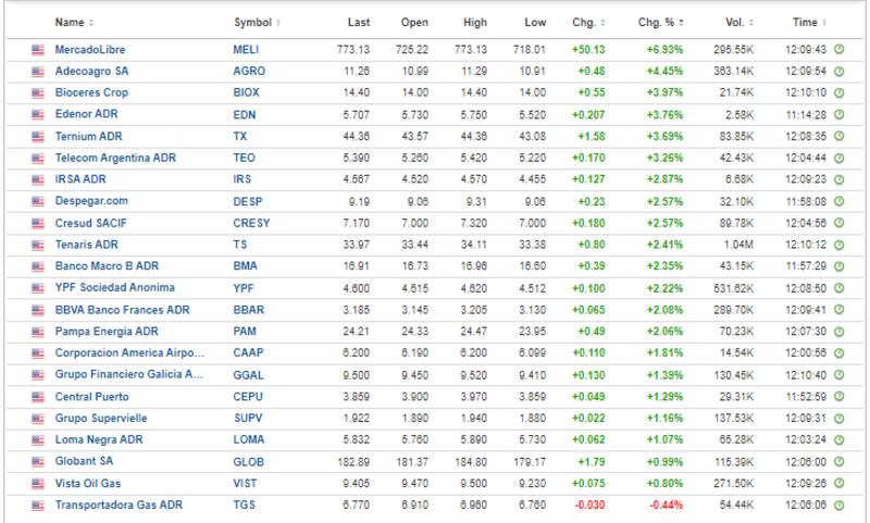 Las subas son lideradas por MercadoLibre que gana 7%, seguido por AdecoAgro y Bioceres con subas de 4,4% y 4 por ciento.