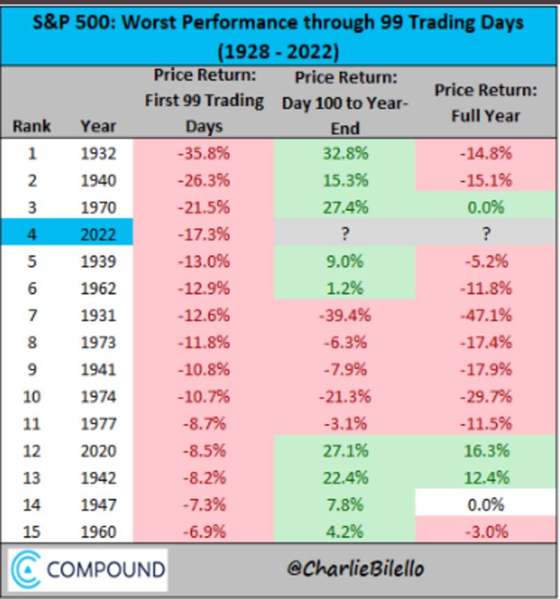 Con 100 días operativos, este es el peor comienzo de año para Wall Street desde 1970, cuando en aquel año el S&P500 llegó a caer 21% en el mismo periodo.
