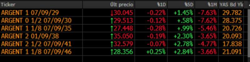 Todos los tramos soberanos operan a la baja, con los Globales 2029 y 2030 cayendo 0,2% y 0,12 por ciento.