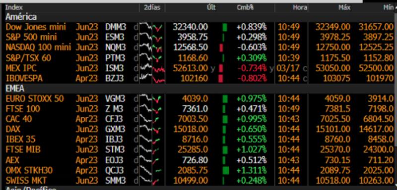 Wall Street vivió una rueda positiva, con el Dow, el S&P 500 y el Nasdaq en verde, mientras que las acciones de los bancos de los Estados Unidos rebotaban, en especial los regionales que estaban desde la semana pasada en el ojo de la tormenta. El índice que los agrupa en Wall Street, el KRE, subió 5%, mientras que el del sector financiero avanzó 1,5 por ciento. Así, el Dow subió 1,2%, el S&P 500 registró un alza de 0,89% y el Nasdaq aumentó 0,39 por ciento.
