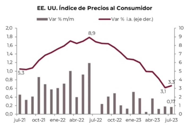 Se espera que las tasas de la Reserva Federal alcancen un techo en niveles de 5,5% a 5,75%, para que luego comience su descenso gradual. En otras palabras, se espera una pausa en la reunión de septiembre, una suba en noviembre al rango de 5,5% y 5,75%.