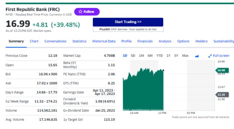 Las acciones de First Republic Bank subieron hasta un 39% en las operaciones previas a la comercialización tras una propuesta de JP Morgan para ayudar al prestamista en apuros.