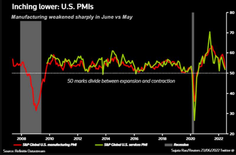 Los avances de los PMI de servicios y manufacturero de EE.UU de junio alcanzaron los niveles más bajos del último tiempo, es decir, desde febrero y agosto de 2020, respectivamente.