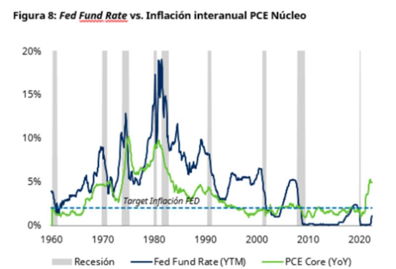 "Después de la sorpresa inflacionaria de mayo, creemos que los riesgos se encuentran a que la Reserva Federal tenga que terminar ajustando la tasa de política monetaria en un mayor nivel al actualmente incorporado, con lo que las preocupaciones respecto a una recesión en Estados Unidos en 2023 seguirán in crescendo", alertaron.
