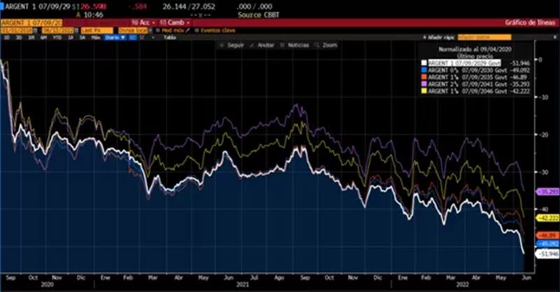 Hoy la probabilidad de default a 2030 se ubica en 98% y, en paralelo, la paridades de los bonos en promedio se ubican debajo de los mínimos alcanzados en el peor momento de la pandemia.
