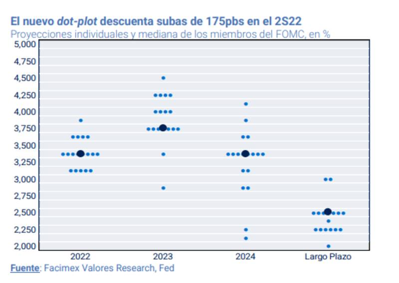 En el comunicado de ayer, los miembros de la Fed actualizaron sus proyecciones económicas y el Dot Plot, es decir, el diagrama de puntos en los que se refleja la trayectoria de tasas de interés que estiman los miembros de la Reserva Federal.