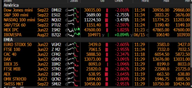 El Dow Jones cae 2%, el S&P500 retrocede 2,8% y el Nasdaq pierde 3,5%. En el acumulado del año, el Dow Jones muestra una baja del 16%, mientras que el S&P500 sigue en terreno de mercado bajista, con una merma del 21%.