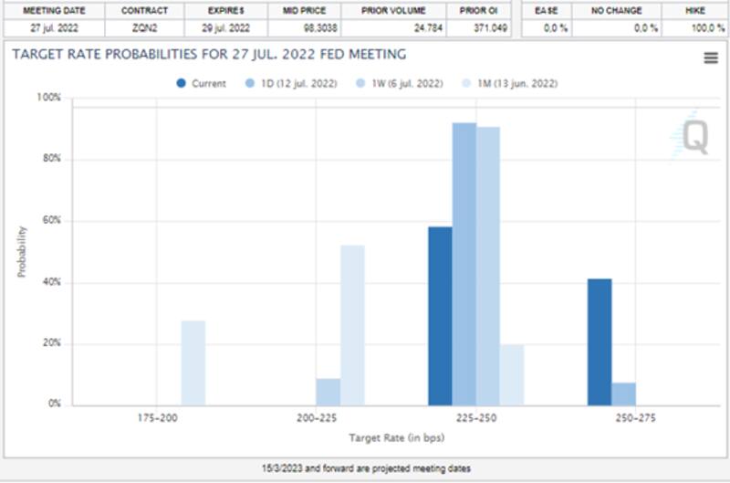 Según datos de Cohen, con este marco de fondo, el mercado descuenta que en la reunión del 27 de julio la Fed ajustará otros 75 puntos básicos la tasa de referencia, para llevarla a 2,5%.