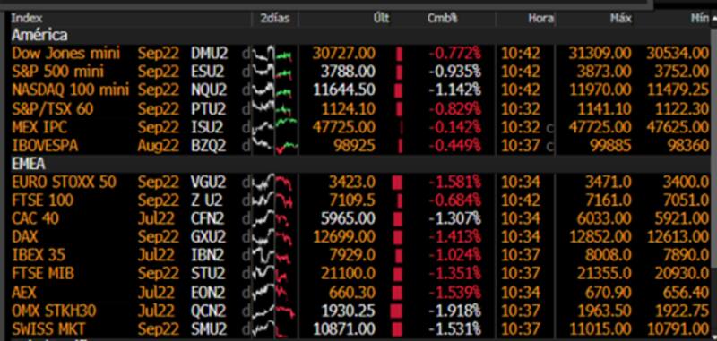 El Dow Jones, el S&P500 y el Nasdaq muestran fuertes bajas, con retrocesos respectivos de 1,1%, 1% y 0,97%. De esta manera, en el acumulado del año, las acciones en Wall Street caen 30% en el caso del Nasdaq, 21% en el caso del S&P500 y 16% en el caso del Dow Jones.