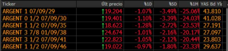 Los bonos argentinos también abren a la baja. Todos los tramos de la curva soberana argentina inician el miércoles en terreno bajista. El tramo corto de la curva cae 1%, el tramo medio pierde 1,28% y el tramo más largo retrocede 1,05%.