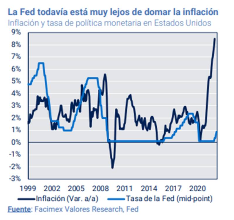 El mercado espera que la Fed suba la tasa 10 veces más este año (25 puntos básicos por movimiento), lo cual implica que podría seguir subiendo la tasa de referencia en 50 puntos básicos por reunión.