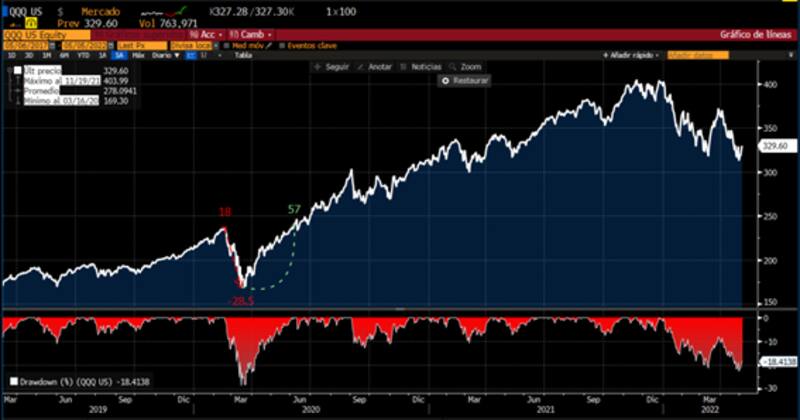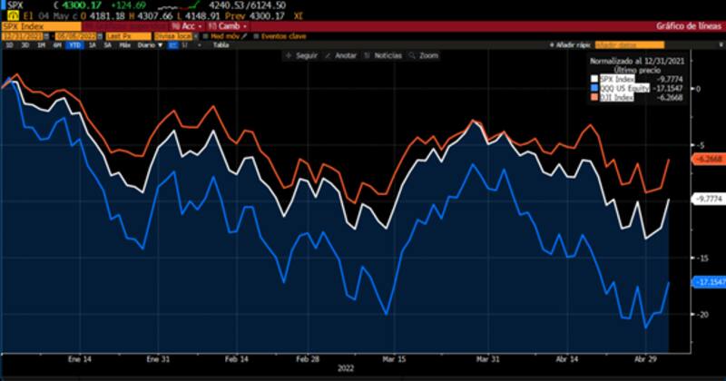 En lo que va del año, los tres principales índices bursátiles americanos operan con pérdidas. El Nasdaq cae 17% este año, el S&P500 retrocede 9,7% y el Dow Jones baja 6,3%.