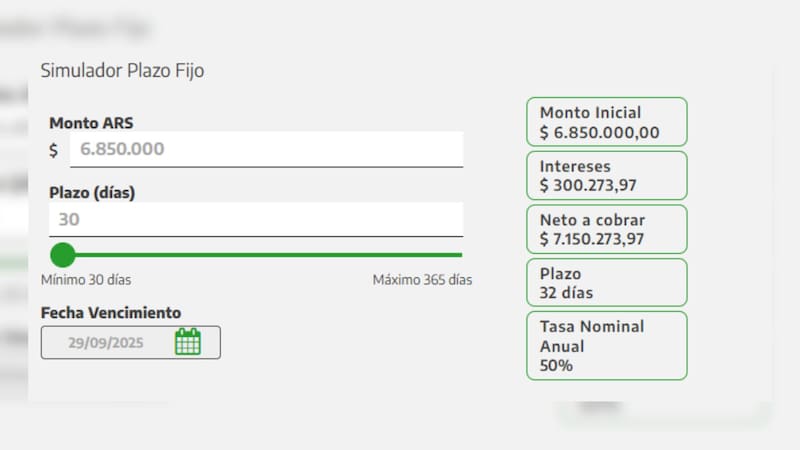 Los plazos fijos establecen diferentes opciones para la duración del mismo y en el caso del Banco de la Provincia de Buenos Aires se puede obtener un rédito de $300.000 al cabo de 30 días (un mes) con una inversión inicial de $6.850.000.