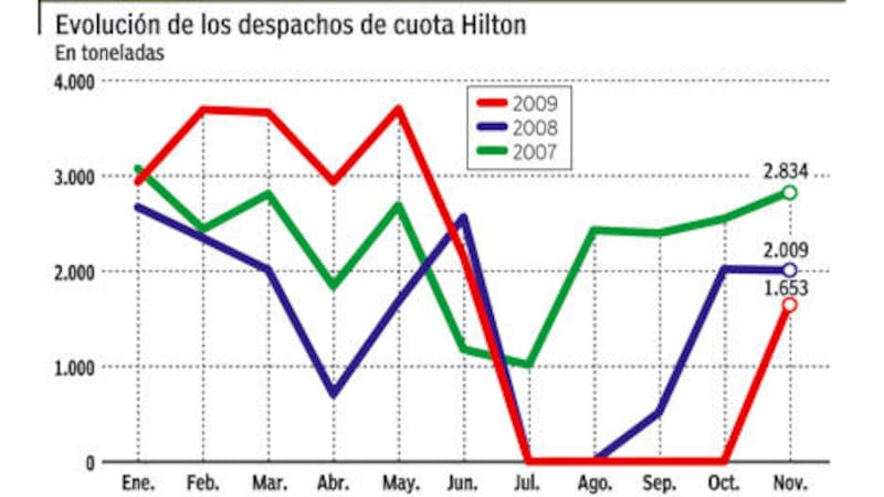 La cuota Hilton, que comprende 28.000 toneladas de carne de alta calidad libre de aranceles, rige del 1º de julio al 30 de junio del año siguiente. El año agrícola 2001/02 se inauguró con el mercado europeo cerrado por la aftosa, y así siguió por siete meses. En lo que va de 2009/10, de acuerdo con las estadísticas oficiales del Senasa, entre julio y septiembre no se despachó una sola tonelada. En noviembre se enviaron 1.653, un 6% del cupo total. Es decir que queda poco más de la mitad del tiempo (en junio sólo se puede embarcar los primeros días para arribar a tiempo a puerto europeo) para enviar el 84% del cupo.