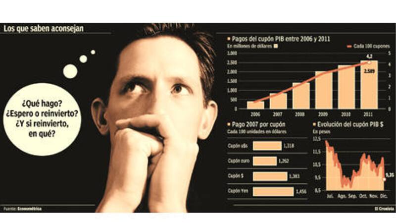 Quienes tengan en su cartera los famosos cupones PIB tendrán el lunes una buena noticia gracias a que el Gobierno, como regalo de navidad, acreditará en las cuentas de los inversores el pago anual de este activo (el segundo que se realiza) por un total de más de u$s 810 millones. Ahora bien, desde el punto de vista del inversor, la pregunta clave es qué hacer con el dinero recibido. Y la respuesta, según los analistas, es unánime: reinvertirlo en cupones o bonos públicos en pesos indexados por inflación.