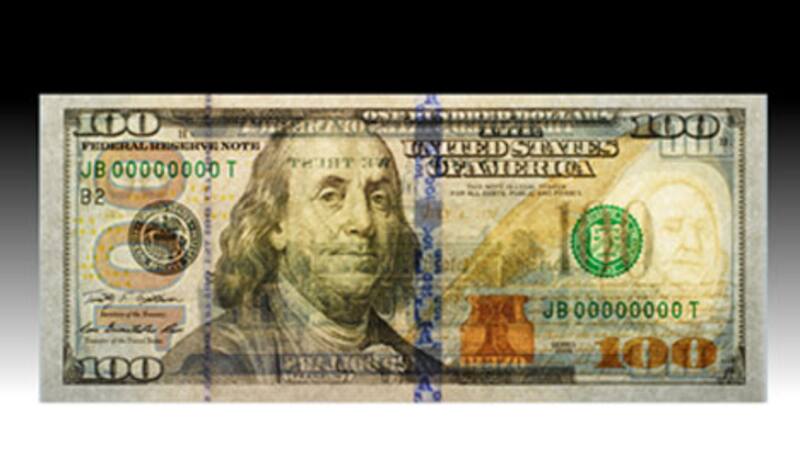 La banda de seguridad en 3-D en el anverso del nuevo billete contiene imágenes de campanas y números 100 que se mueven y cambian de una a otra cuando usted inclina el billete. La campana en el tintero en el anverso del billete es otra característica de seguridad nueva. La imagen de la campana cambia de color cobre a color verde cuando se inclina el billete, y, produce un efecto que hace parecer que la campana aparece y desaparece dentro del tintero de color cobre.