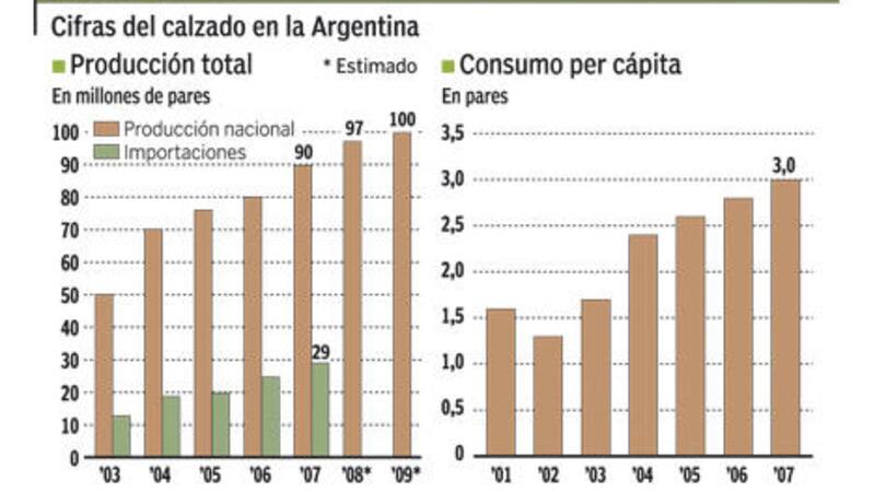 Pese el incesante incremento de las importaciones, los fabricantes de calzado cerraron 2007 incluso mejor de lo que habían previsto: confeccionaron en el país 90 millones de pares, 2 millones más de lo estimado, frente 79,8 millones de 2006 y apenas 36,4 millones de 2001. Con estos números batieron el récord histórico de los ‘80, cuando hacían en el país 80 millones de pares, según datos de la Cámara de la Industria de Calzado (CIC). Así, acompañaron la mayor demanda: cada argentino compró tres pares de calzado en 2007, casi el doble que antes de la crisis, en 2001.