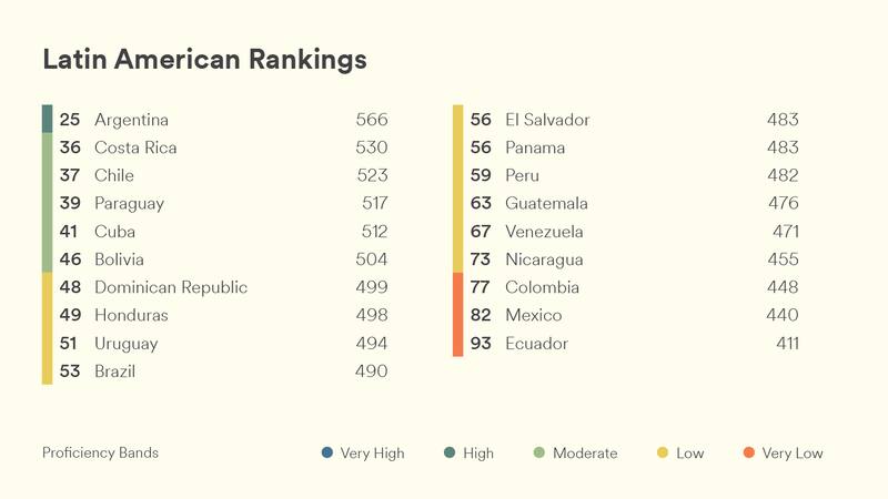 El EF English Proficiency Index, único ranking global del nivel de inglés, coloca como líder del idioma a Países Bajos con un puntaje de 652, equivalente a un nivel C1 del Marco Común de Referencia Europeo (avanzado inferior) siendo el nivel más alto que alcanza un país no nativo. Detrás le siguen el conjunto de países de la región escandinava (Dinamarca, Suecia, Finlandia, Noruega), que han logrado un óptimo desarrollo de la segunda lengua gracias a políticas de estado como un enfoque temprano en las habilidades de comunicación, exposición diaria al inglés dentro y fuera de las aulas en las escuelas, y educación del lenguaje específico para el ejercicio profesional en los últimos años de estudio, ya sea en una escuela vocacional o en la universidad.