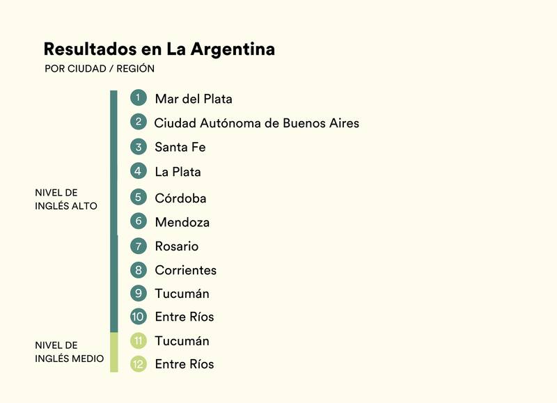 Volviendo a Argentina, su situación local muestra resultados significativos en el EF EPI. Un ejemplo claro, es el dominio de inglés que ha mostrado la Ciudad Autónoma de Buenos Aires con un puntaje de 596 que marca una diferencia notable colocándose por encima de países como Suiza, República Checa y Grecia. Detrás de esta, la siguen muy de cerca las provincias de Santa Fe, Córdoba y Mendoza con un puntaje que los coloca en un nivel de alta capacidad de conocimiento del idioma. Además, el informe de 2020 destacó a las provincias de Tucumán y Corrientes que mejoraron significativamente su nivel respecto del año anterior y las ciudades de Mar del Plata, La Plata y Rosario siguen siendo las más referentes del país en el idioma.
