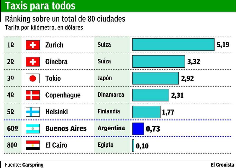 Suiza, por su parte, es en lo que respecta a costos la peor opción. Zurich primero y Ginebra después ocuparon las primeras posiciones del ranking entre las ciudades más costosas para tomarse un taxi. Allí, la tarifa mínima es de u$s 8,30 y u$s 6,53, respectivamente, y cada kilómetro extra cuesta en cada caso u$s 5,19 y u$s 3,32. Le siguen Tokio, en Japón; Copenague, en Dinamarca; y Helsinki, en Finlandia.