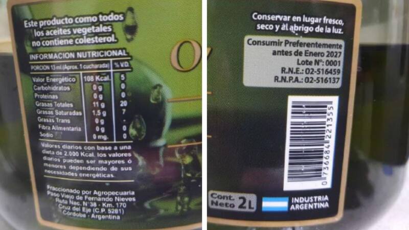 "Aceite de oliva, Extra Virgen, sabor intenso, marca: Olivares del Rey, Cont. Neto 2 L, consumir preferentemente antes de enero 2027, Lote 0001, RNE N° 02-516459, RNPA N° 02-516137, fraccionado por Agropecuaria Paso Viejo de Fernando Nieves, Ruta Nac. N° 38 Km 170, Cruz del Eje, Córdoba"