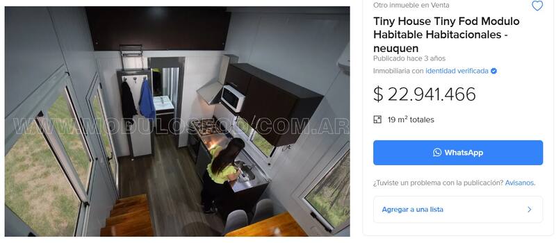 Las Tiny House ofrecida en la página de compra y venta informa que el precio publicado corresponde al valor de la propiedad sin accesorios. En la misma línea, se debe tener en cuenta que el envío no está incluido en el precio.