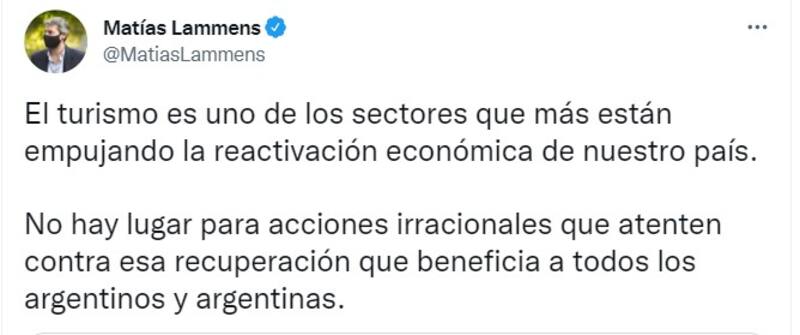"El turismo es uno de los sectores que más están empujando la reactivación económica de nuestro país. No hay lugar para acciones irracionales que atenten contra esa recuperación que beneficia a todos los argentinos y argentinas", coincidió el ministro de Turismo, Matías Lammens.