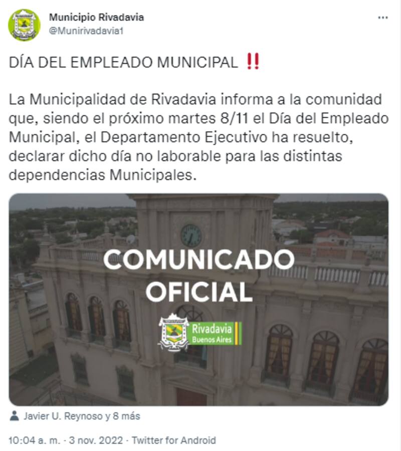 "La Municipalidad de Rivadavia informa a la comunidad que, siendo el próximo martes 8/11 el Día del Empleado Municipal, el Departamento Ejecutivo ha resuelto, declarar dicho día no laborable para las distintas dependencias Municipales", indica el anuncio oficial.
