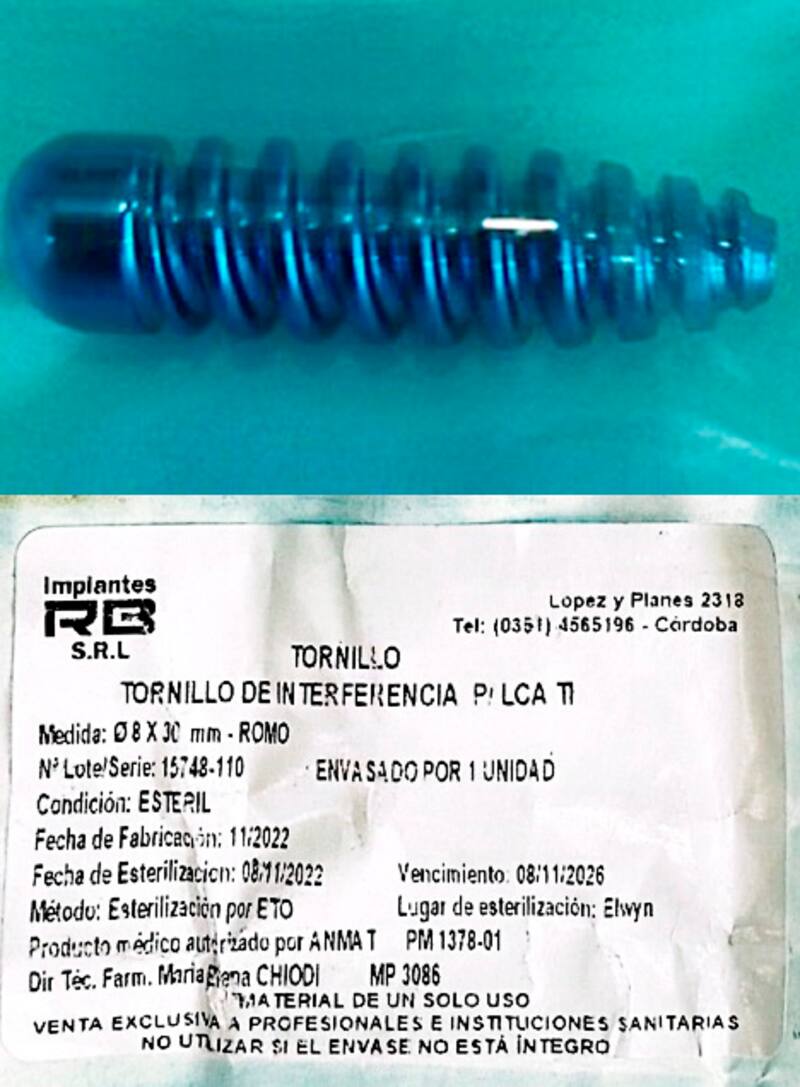 La ANMAT dio con el lote de insumos en un procedimiento de control donde se hallaron "unidades falsificadas de un tornillo de interferencia" en un distribuidor de productos médicos bajo el rotulado "Implantes RB SRL- Tornillo de interferencia p/LCA. TI".