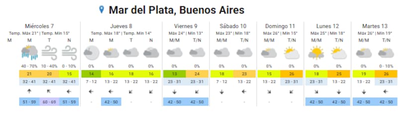 - Martes 13: mínima de 19°C y máxima de 26°C, con el cielo mayormente nublado y ráfagas de hasta 50 km/h.
