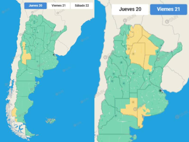 De acuerdo a la información que brindó el Servicio Meteorológico Nacional (SMN), este jueves la alerta amarilla indicó que llegarán las tormentas aisladas por la tarde y noche al centro y este de Mendoza, al sur de San Juan y sudoeste de Santa Cruz.