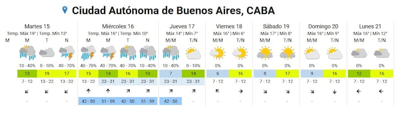 Según informó el SMN en su página oficial, durante la noche del martes 15 se formará una tormenta por los fuertes vientos provenientes del sur. El fenómeno climático se hará sentir durante el martes en el AMBA, día en el que se espera que llueva tanto en la Ciudad como en la provincia.