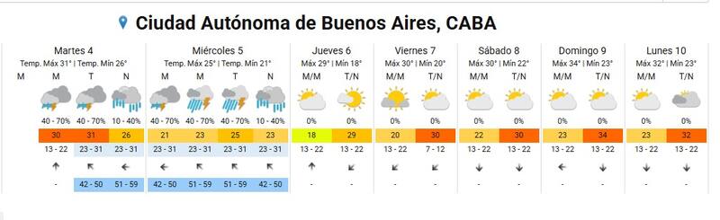 Según el SMN, el clima mejorará para el jueves 6, ya que según su página web oficial estará despejado y sin probabilidad de lluvia. Tendrá una mínima de 18° y una máxima de 29°.