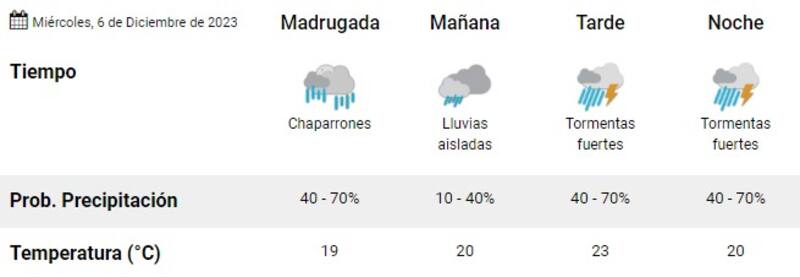 Mientras que, para el día miércoles, se esperan chaparrones en la madrugada, lluvias aisladas en la mañana, y a la tarde y noche tormentas fuertes. La temperatura mínima será de 19 grados y la máxima de 23. Recién el día jueves 7 de diciembre dejará de llover según informa el Servicio Meteorológico Nacional.