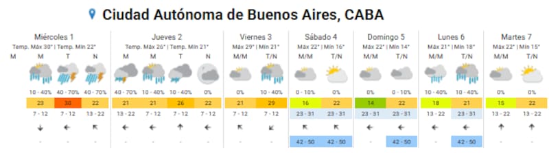 - Miércoles 1: mínima de 22°C y máxima de 30°C, con tormentas fuertes por la tarde y noche.