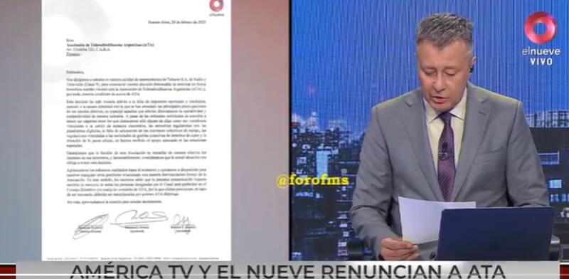Acto seguido, Rolando Graña cedió la palabra a su par de Canal 9, quien procedió a leer el texto de América. El documento, dirigido al presidente de la ATA, Eugenio Sosa Mendoza, expresó: "Nos dirigimos a usted para poner en vuestro conocimiento, por este medio, nuestra voluntad de renunciar a la calidad de socios de la Cámara que preside y, en consecuencia, a los cargos que, en virtud de ella, ocuparan hasta la fecha nuestros representantes".