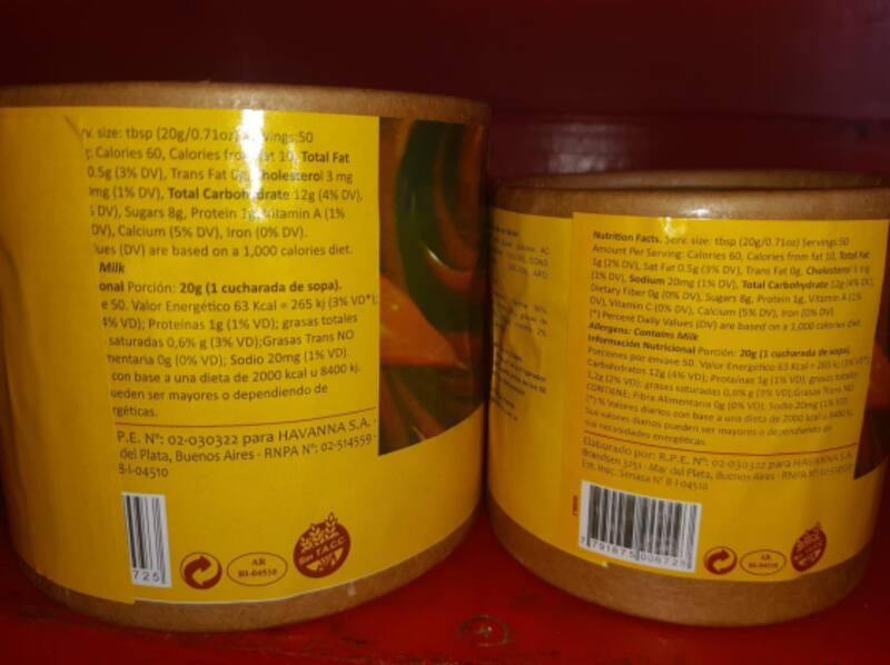 Actualmente Havanna solo tiene disponible en su sitio web el dulce de leche de su marca en envase de vidrio de 450 gramos, siendo el rotulado muy similar al falsificado.